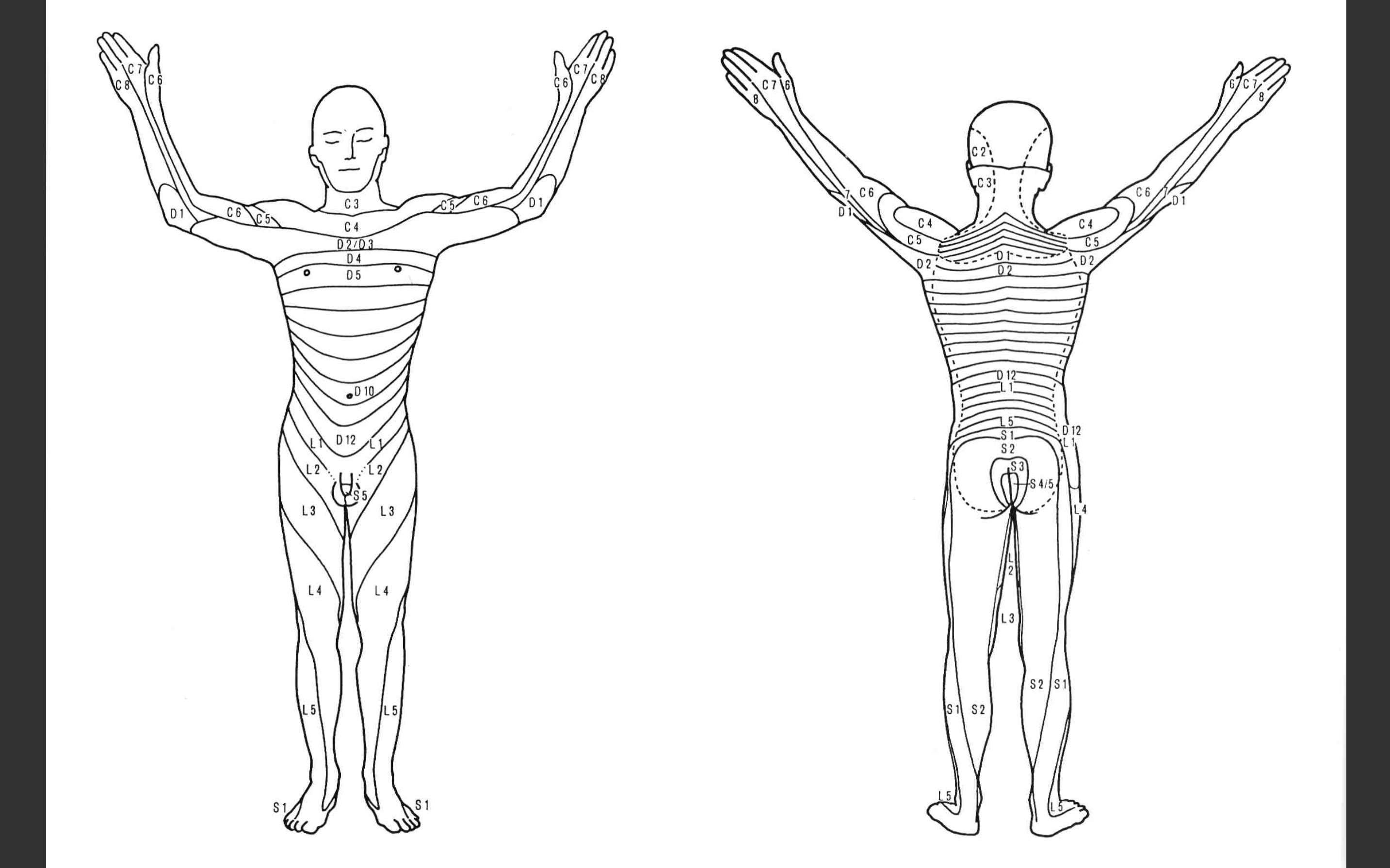 Uralte Dermatomkarte, aber sehr übersichtlich. Diese D10-Schreibweise ist etwas veraltet, heute würde man Th10 schreiben …